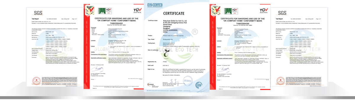 東莞全球環(huán)保科技有限公司總部位于東莞東部地區(qū)、公司致力于全生物降解材料和全生物降解秸稈復合材料的生產研發(fā),專業(yè)提供全生物降解 CCBM系列材科,PBAT、PBS、PLA樹脂及全生物降解膜袋、筒膜、餐具覆膜、阻隔膜、復合包裝膜、衛(wèi)生巾膜等產品。給塑料制造商和消費者提供一站式全品類的解決方案和技術支援。產品已通過德國DIN CERTCO、歐洲TUV公司OK compost HOME認證、國標認證GB/T19277.1-2011:符合歐盟EN13432、美國ASTMD6400、 BPI、澳洲ABA堆肥降解檢測標準,并通過SGS公司檢測的FDA食品接觸安全測試、ROHS有害物質檢測、REACH檢測。我司獲得國家高新技術企業(yè)認證、通過了GRS驗廠并且取得了GRS認證,產品熱銷于歐洲、美國、亞洲等30多個國家。